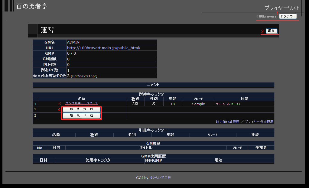 - キャラクターシートを新規作成します。ログインしていなければ表示されません。