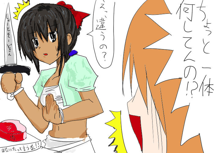 | 容姿: 身長 ;153cm 顔つき:おさな目だけども目つきはしゃっきりな。ちょっと強気そう。 体型 :胸小さめ、腰普通、脚はすんなり。曲線というよりは健康的。 髪型 :結構ながめのを括ってまとめて上げるような。 服装 :装備のコートの下はアラビアの山賊っつーかアラジンっぽいヤツにさらし。 割と箱入り。割と世間知らず。割と強気。割と素直。損をするのは親分の務め。何のかは知らん。 料理の腕はウェットかつワイルドなものならそこそこ。でもそれは誰でもですね。スパイスバンザイ。他は色々壊滅。 肉食。何は無くとも肉を食え。肉が増えると野菜も食べる。かなり食べる。 つきみさんに普段のむっすりシャマーラのイラストをもらいました。ありがとうございます! つきみさんに料理に向かうシャマーラのイラストをもらいました。料理をするシャマーラさん。 肉をショッソで突き刺してそのまま焼けば最強じゃねって安直な発想の図。とめられて調理法がわからなくなり涙目 ありがとうございます!! メインBGM「俺たちゃ海賊(フルコーラス版)」 |