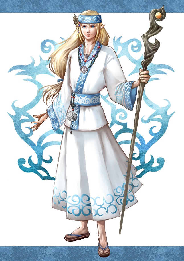 | ○容姿 髪色:金髪 瞳色:碧眼 身長:187cm 体重65kg ひょろりノッポさん 肌色:限りなく白い 衣服:独特の民族衣装を着ている(アイヌ民族衣装イメージ) 頭髪:長い髪をバックでまとめている。 ○性格・趣味 穏やかで物腰の柔らかい青年(に見えるが100歳超え)。一見してよく女性と間違えられる。 名前はアイヌ語で「治癒の雨」という意味。 性格も外見どおり穏やかかつ柔和で、フェトルの神官として他者へは慈悲深く接する。 時折、分からない言葉で話す事もあり、ちょっと天然さん。 絵を描く事が好きで、父の手習いで覚えた絵画がめきめき上達。 ある地方都市で開かれた絵画展に出展した時に最優秀賞を取ってしまった事もあるほど上手い。 幼い頃は路銀を稼ぐために物乞いをしたこともあるが、成長するにつれ上達した絵で辻描きなどで路銀を稼ぐようになる。 風景画がもっとも得意だが、人物画も出来る。 ○経歴 物心がついた頃には、父に連れられて、諸国を旅して回っていた。幼い頃のことをあまり覚えていないので、正確な年齢はわからない。 100歳は超えているが、もう数えるのをやめてしまっている。どうせエルフの寿命は長いのだから、と。 リーゼン地方に来たのは5年前で、当初はアルフォートにいた。 1年前にオルレイアへ。いつも通り辻描きで稼いで帰宅すると、父が倒れていた。 すぐさま癒そうとするものの、癒しの力も及ばず。 出入りしていたフェトル神殿に診てもらうと、原因不明の奇病だとの事。 即座に死に至るわけではなさそうだが、仕事や旅はもう無理だろう、と。 父には神殿の医療施設に入ってもらった。そして父の治療代を稼ぐために、冒険者になる事を決意する。 「何かの大会で優勝したことがある」 ある街の絵画展で最優秀と評された事がある。 「故郷の場所を知らない」 物心ついた頃から、父と旅暮らしをしていた。 「異性の家族がいない」 父と2人暮らしである。 ※信仰:慈雨神フェトル ※妖精魔法 水1 光3 風3 闇3 ○ルアンベアイヌ語解説 ヤイ=自分 ルアンベ=雨 イワンケレ=治る、全快 ハチャ=父親 エルフ 生まれ:神官 / 初期所有技能:プリースト 技:9 体:5 心:12 A:4 B:4 C:1 D:3 E:8 F:7 器用:13 敏捷:13 筋力:6 生命:8 知力:20 精神:19 ダイス平均:2.4545 / 能力値合計:79 |