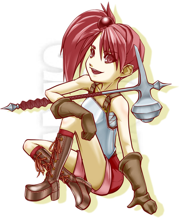 | 赤髪を右サイドでテールにしている。サイドテールにはマギスフィアがくっついている。 ツリ目で、不敵な笑み。 | ||||||||||||||||||||||||||||||||||||